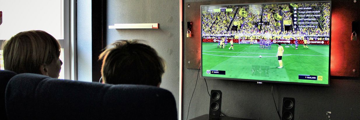 Vores hyggelige Playstation-rum er udstyret med en PS5 samt behagelige biografsæder, hvor man kan tage et spil FIFA med sine venner.